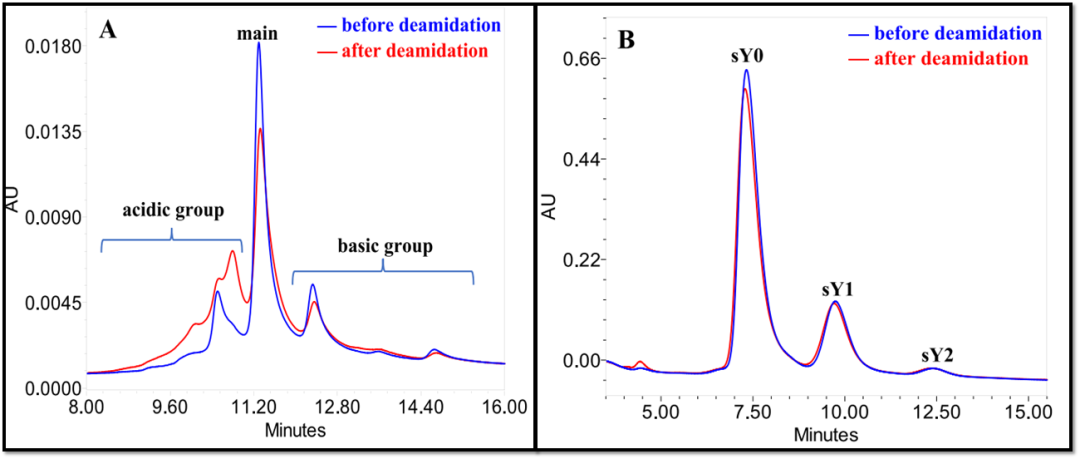 圖2展示了pH為4的條件下,不同分離模式下對于脫酰胺樣品的分離情況。圖1.A顯示,在pH值為4時,脫酰胺使酸性基團從21.1%增加到36.3%。而如圖1.B所示,sY0峰從74.2%略微下降到73.4%,伴隨有一個小的早期洗脫峰從0.2%上升到0.9%。sY1和sY2的水平相對穩(wěn)定,分別在23.0%和2.7%左右,整體無顯著變化。雙抗脫酰胺前后進行離子交換和疏水色譜的分析結(jié)果顯示脫酰胺對HIC法測定的該雙抗硫酸化變體沒有影響,Proteomix HIC Butyl-NP5色譜柱可以避免與質(zhì)子化產(chǎn)物發(fā)生非特異性相互作用。