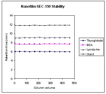 Nanofilm SEC固定相具有致密的涂層鍵合密度,因此可阻止任意分子破壞硅膠與固定相之間的鍵合,從而保證填料具有高的穩(wěn)定性。Nanofilm SEC固定相可用于多種緩沖液中,如醋酸銨、磷酸鹽、Tris等。當(dāng)用150和100mM的磷酸緩沖液(pH7.0)作為流動相時,在3個月或進(jìn)樣1000次后Nanofilm SEC柱的性能僅會發(fā)生輕微的改變,保留時間的偏差在5%以內(nèi)。圖5是Nanofilm SEC-150在1、5和10天,每天運行10小時得到的結(jié)果。從圖中可以看到流出曲線基本重合。圖6是兩周內(nèi)蛋白和一個小分子在500倍柱體積內(nèi)保留時間的變化情況。從圖中可以看到保留時間變化的差異非常小。 Nanofilm SEC固定相可在高鹽濃度,如1.0M下使用。另外,Nanofilm SEC柱在有機(jī)溶劑如甲醇、乙醇、THF、DMF、DMSO等中,以及其與水的混和溶液中也相當(dāng)穩(wěn)定。 Nanofilm SEC柱在pH 2-8.5范圍內(nèi)穩(wěn)定。另外,在短時間內(nèi)也可以耐受高的pH,如pH 8.5-10。 Nanofilm SEC柱在溫度耐受方面表現(xiàn)突出。最高工作溫度可達(dá)到80°C。