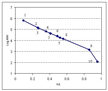 樣品:1. 甲狀腺球狀蛋白(670kD), 2. IgG(150kD), 3. BSA雙聚體(132kD), 4. BSA (66kD), 5. 卵清蛋白(44kD), 6. 肌紅蛋白(17.6kD), 7. 溶菌酶(14.3kD), 8. B12 (1.35kD), 9. 尿嘧啶(120D)